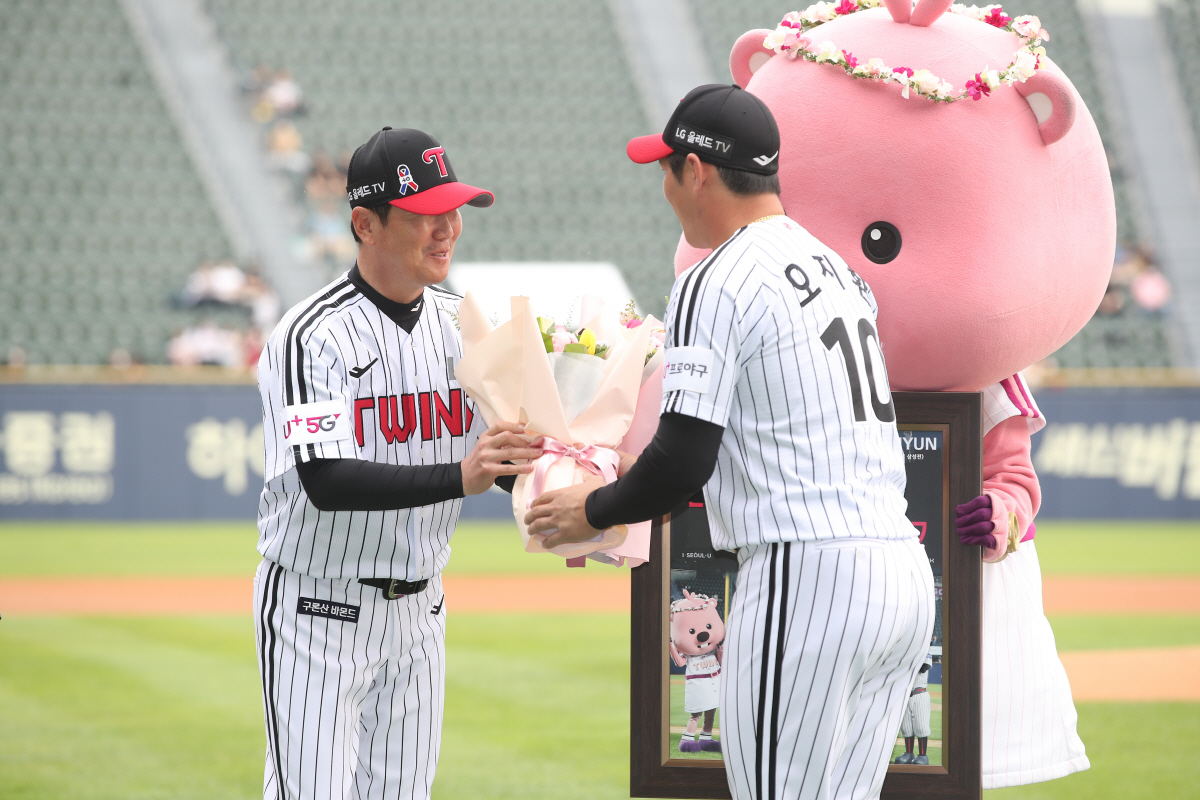 LG 트윈스는 4일 잠실구장에서 열린 SSG 랜더스전에 앞서 류지현 감독의 100승을 축하하는 행사를 간단하게 치렀다. 류지현 감독은 지난달 28일 삼성 라이온즈전을 통해 개인 통산 100승을 달성한 바 있다. 류 감독이 2021년 LG 지휘봉을 잡은 뒤 2번째 시즌 도중 달성한 것.
