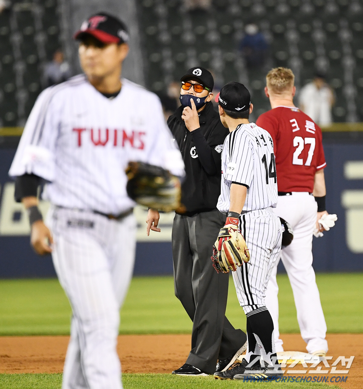 2022 KBO리그 LG 트윈스와 SSG 랜더스의 경기가 3일 잠실구장에서 열렸다. 7회초 2사 만루 SSG 김민식의 타구가 LG 선발 켈리의 글러브를 맞고 2루심 다리에 맞은 것에 대해 서건창이 어필하고 있다. 잠실=박재만 기자 pjm@sportschosun.com/2022.06.03/