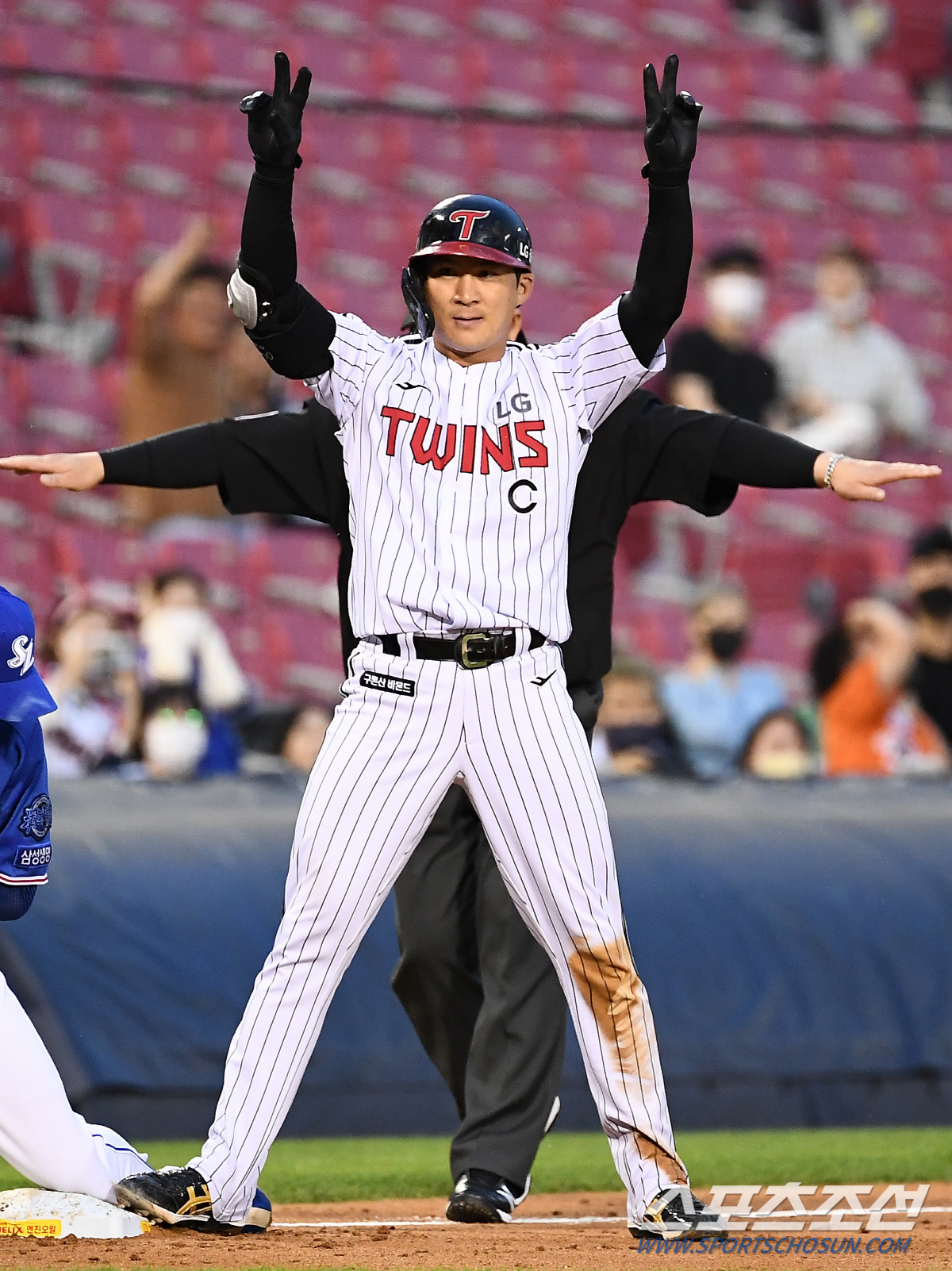 align='left" bgcolor='#ffffff" class='caption'>2022 KBO리그 LG 트윈스와 삼성 라이온즈의 경기가 14일 잠실구장에서 열렸다. 3회말 2사 만루 LG 오지환이 적시타를 날린 뒤 환호하고 있다. 잠실=박재만 기자 pjm@sportschosun.com/2022.06.14/