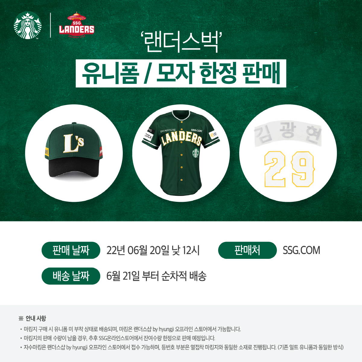 [스포츠조선 나유리 기자]SSG 랜더스가 오는 24일부터 26일까지 인천 SSG랜더스필드에서 진행되는 '스타벅스 데이'를 기념해, 20일 오후 12시부터 SSG와 스타벅스(SCK컴퍼니)가 협업해 출시한 '랜더스벅' 유니폼과 모자, 마킹지 판매를 실시한다.