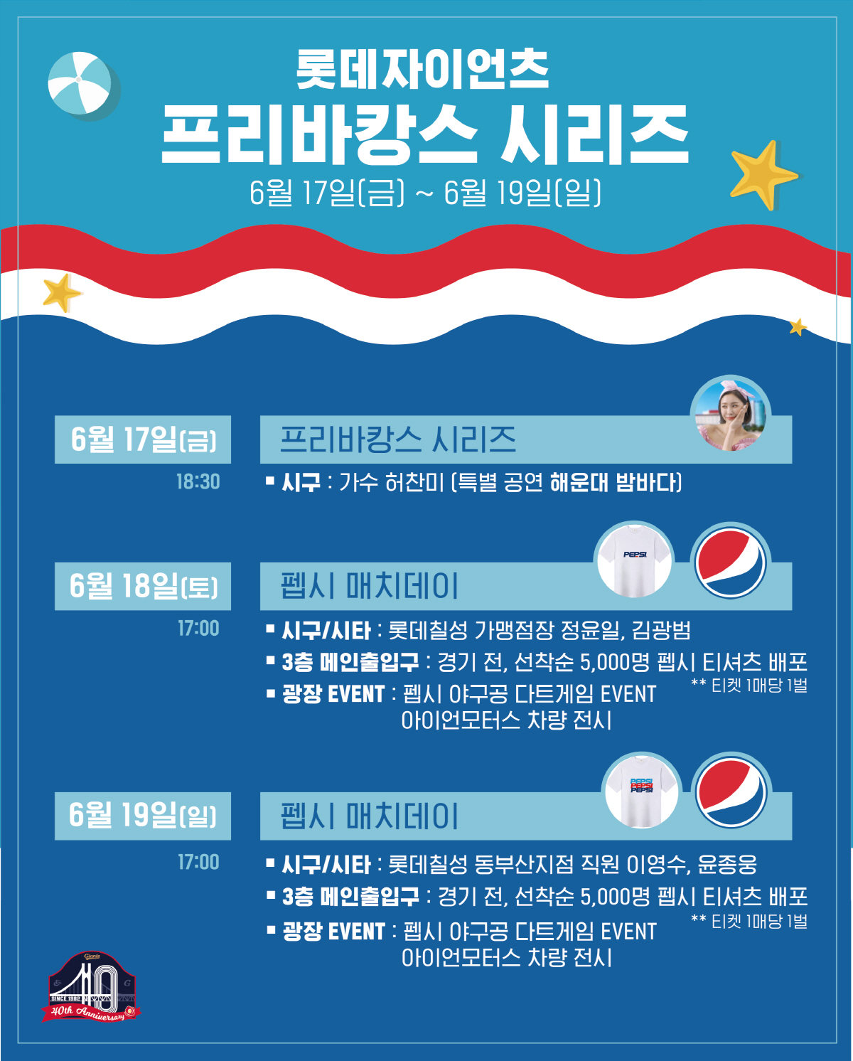 18일과 19일은 글로벌 음료 브랜드 펩시와 함께하는 행사가 이어진다. 18일은 정윤일, 김광범 롯데칠성 가맹점장이 각각 경기 전 시구·시타자로 나서며, 19일은 롯데칠성 동부산지점 직원 이영수님이 시구, 윤종웅 님이 시타자로 나서 롯데의 승리를 기원한다. 양일간 경기 전 3층 메인게이트에서 선착순 5,000명에게 펩시 기념 티셔츠를 나눠주는 행사도 마련된다.