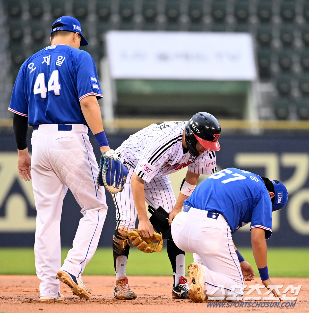 경기초반 아찔한 장면이 있었다. 1회말 LG 박해민이 2루 도루를 시도했고, 김재성의 송구는 다소 오른쪽으로 치우쳤다. 공을 잡기 위해 글러브를 뻗은 왼손이 달려들어오던 박해민과 충돌했고, 이해승은 손을 감싸쥔채 주저앉아 한동안 고통을 호소했다. 박해민 또한 지난해까지 같은 유니폼을 입고 뛰던 사이. 타임을 요청한 뒤 이해승에게 미안한 마음을 전했다.
