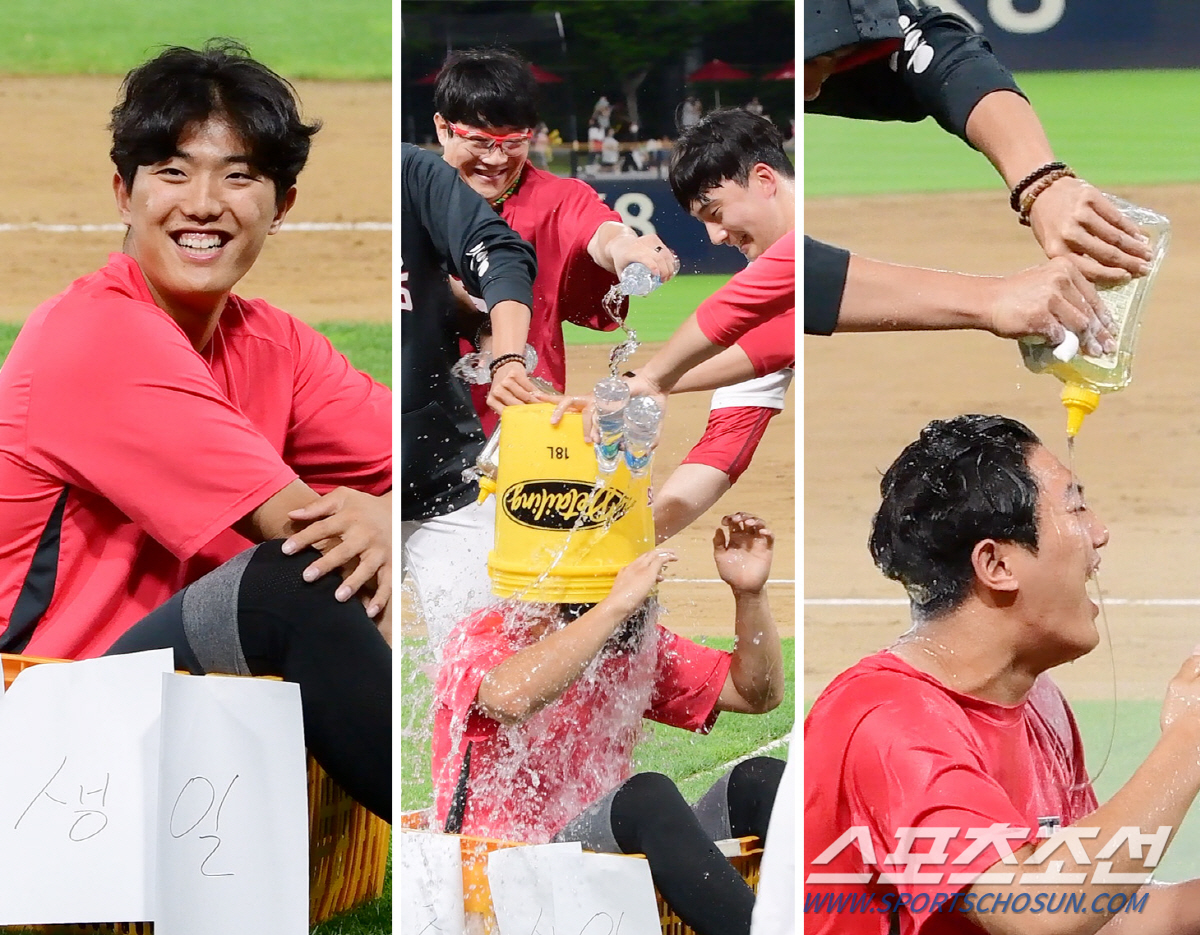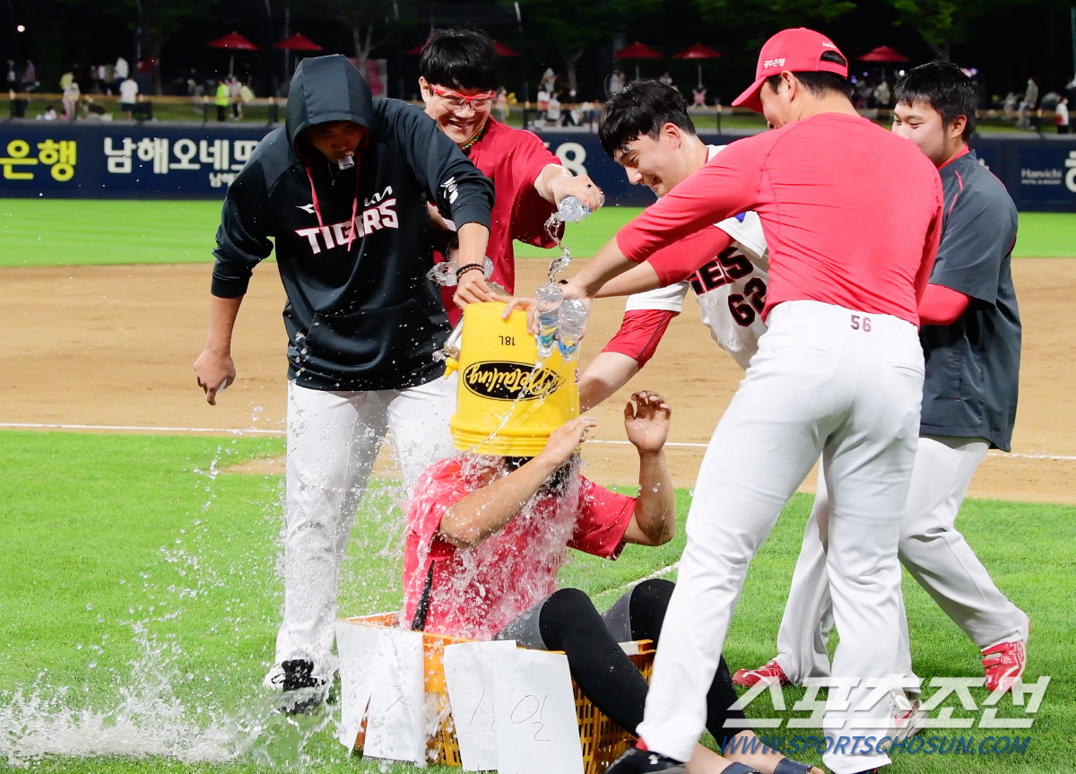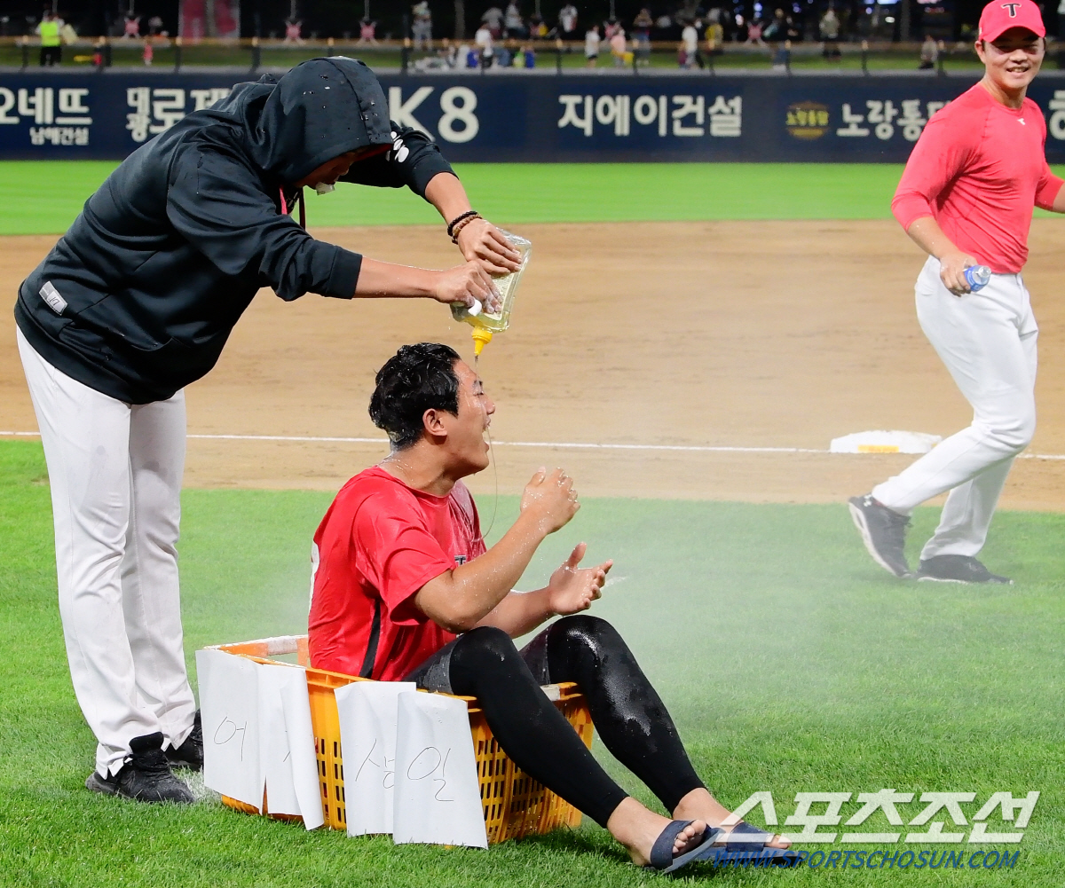 음식 대신 다양한 액체들이 동원됐다. 커다란 버킷에 물과 이온 음료, 꿀 등을 골고루 섞었다. 이의리에겐 그라운드에 준비해 둔 바구니에 들어가 꼼짝 말고 앉아 있도록 '엄포'를 놨다. 관중석에서 지켜보던 팬들이 이의리를 위해 생일 축하 노래를 합창하며 분위기를 띄웠다.