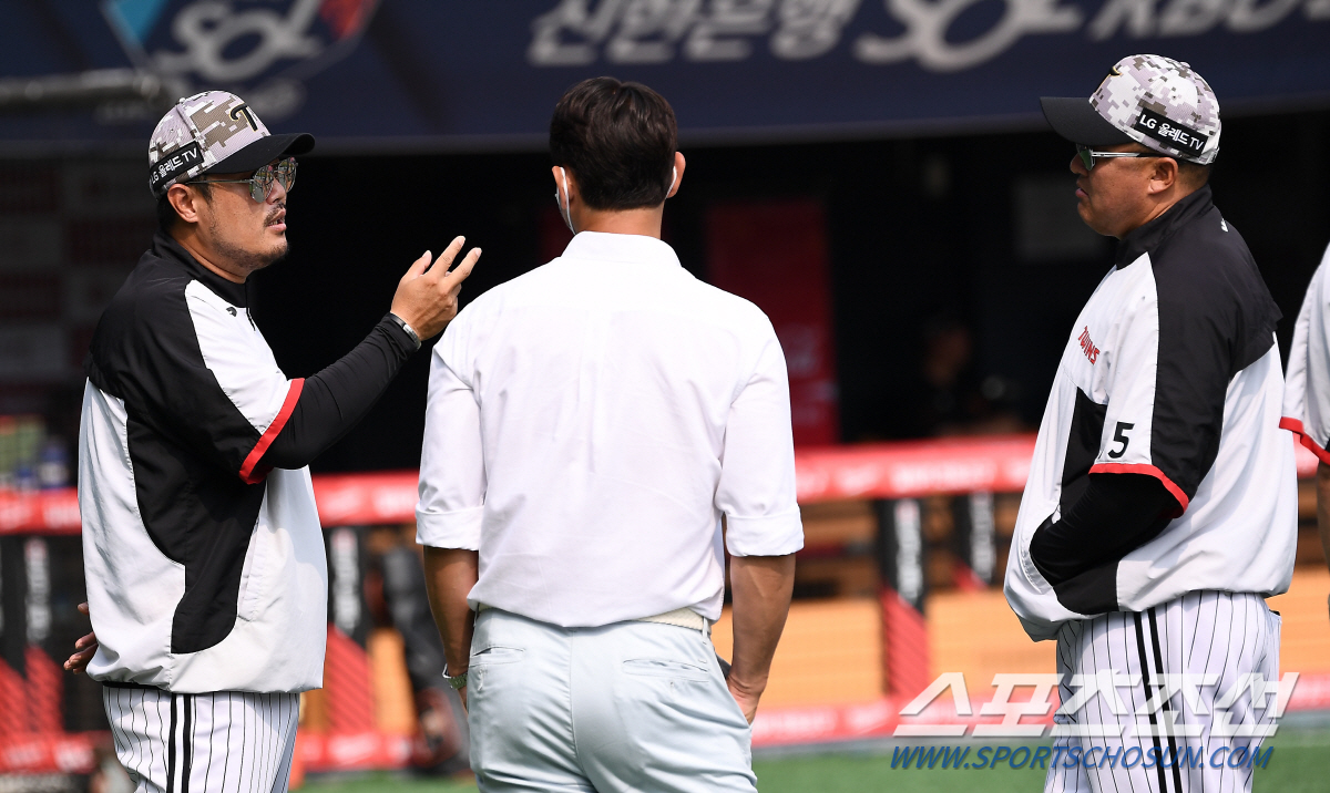 2022 KBO리그 LG 트윈스와 한화 이글스의 경기가 22일 잠실구장에서 열렸다. LG 이호준, 조인성 코치가 박용택 해설위원과 대화를 나누고 있다. 잠실=박재만 기자 pjm@sportschosun.com/2022.06.22/