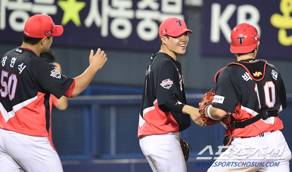 2022 KBO리그 두산베어스와 KIA타이거즈의 경기가 24일 서울잠실야구장에서 열렸다. KIA 류지혁이 마지막 아웃카운트를 잡은 후 장현식, 박동원과 환호하고 있다. 잠실=최문영 기자 deer@sportschosun.com/2022.06.24/