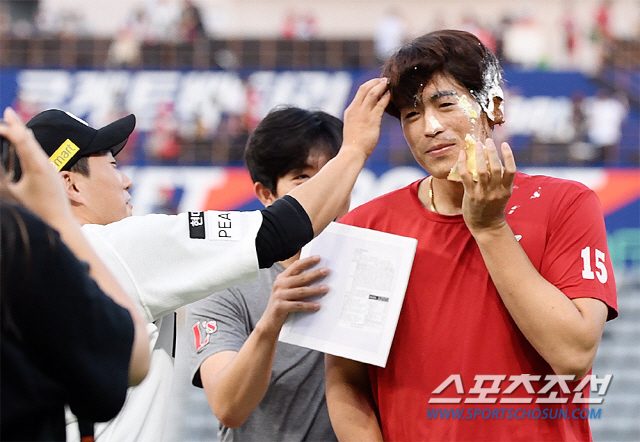 3일 인천 SSG 랜더스필드에서 열린 KIA 타이거즈와 SSG 랜더스 경기. SSG가 3대2로 승리했다. 승리투수 이태양이 생일케익 세례를 받고 있다. 인천=정재근 기자 cjg@sportschosun.com