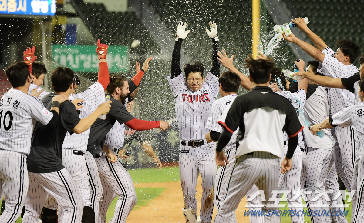 30일 서울 잠실구장 KT 위즈와 LG 트윈스 경기. 10회말 무사 문보경이 끝내기 홈런을 치고 들어오며 환영받고 있다. 잠실=정재근 기자 cjg@sportschosun.com/2022.7.30/