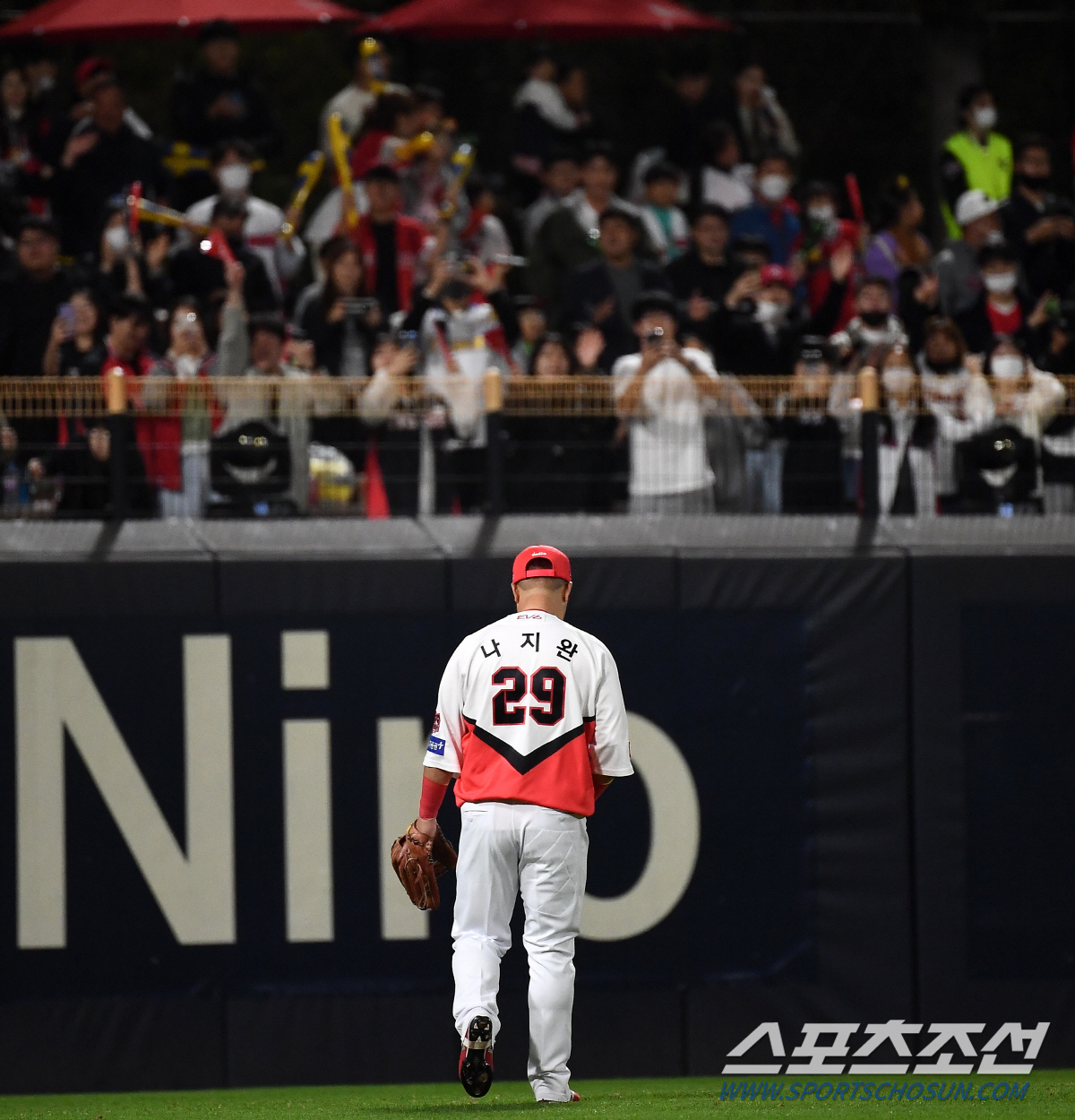 4년 만에 포스트시즌 진출을 확정 지은 이날 KIA 타이거즈 선수단과 1만5715명의 팬들은 자리를 떠나지 않았다. 15년을 한 팀에서 뛴 프랜차이즈 스타, 타이거즈의 홈런왕이란 타이틀을 짊어지고 있었던 '나비' 나지완(37)의 마지막 발걸음을 지켜보기 위한 기다림이었다.