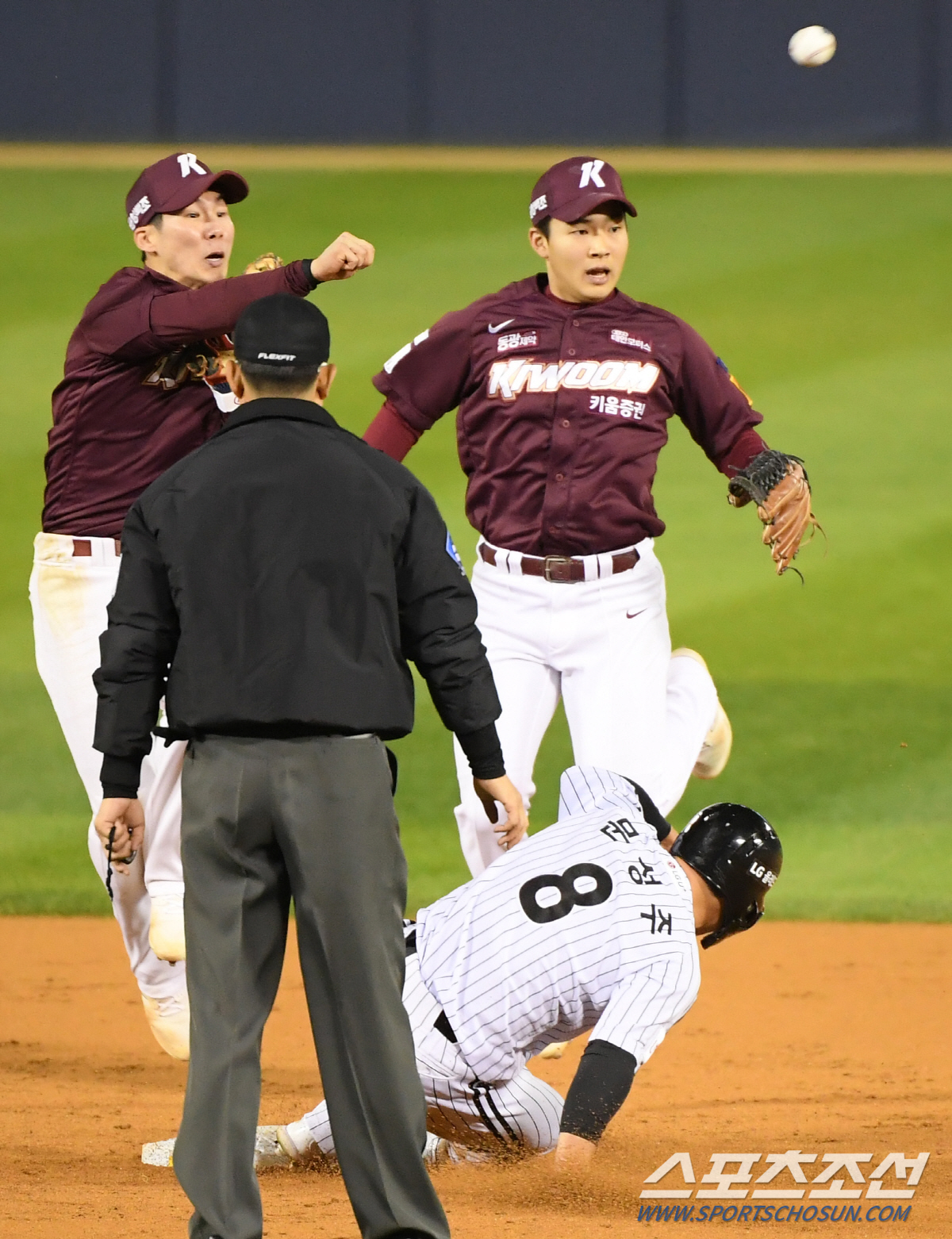 LG도 2회말 1사후 주자를 쌓았다. 문보경의 중전 안타 뒤 문성주가 친 1, 2간 타구를 김혜성이 막았으나 내야 안타가 되면서 1사 1, 2루 상황이 만들어졌다. 타석엔 유강남이 섰고, 키움은 내야 키스톤 콤비의 위치를 왼쪽으로 다소 치우친 수비 시프트를 시도했다. 선발 투수 타일러 애플러는 낮은 공으로 땅볼을 유도했다. 타구는 2루 베이스 오른쪽에 있던 김혜성의 글러브를 정확하게 향했다. 김혜성의 송구를 시작으로 유격수 김휘집이 2루 포스 아웃 후 1루로 송구, 타자 주자를 잡는 더블 플레이로 이닝을 마칠 수 있는 기회였다.