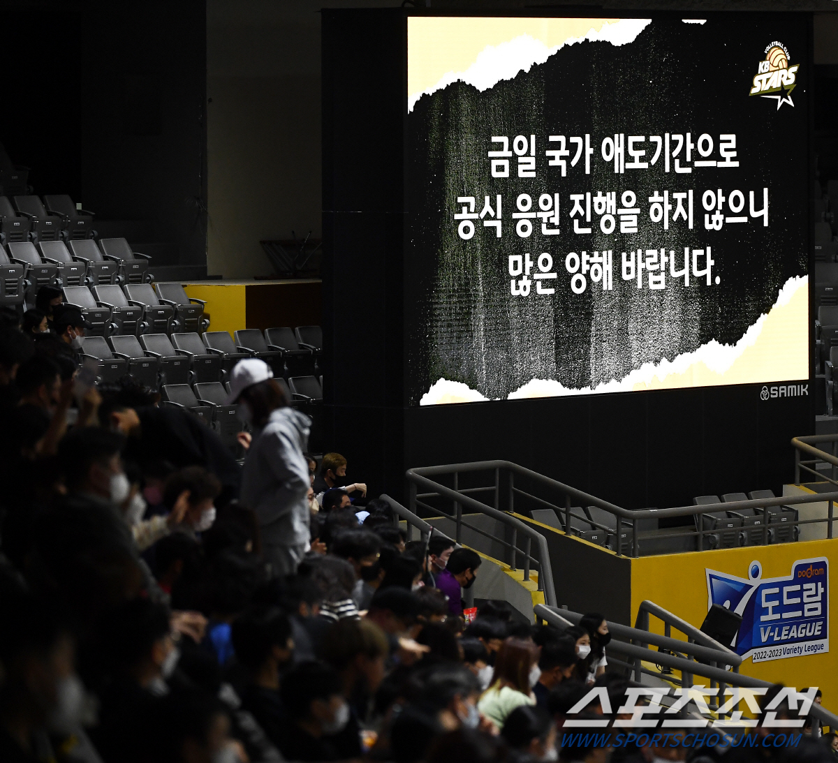 한국배구연맹은은 30일 "이태원 사고에 대한 국가 애도 기간의 종료인 11월 5일 자정까지 희생자를 추모하기 위해 출전 선수 전원이 검은리본을 착용하고, 경기 전 추모 묵념 등 관련 조치를 시행한다. 응원 단장, 치어리더, 장내 아나운서 등 응원 주도는 자제될 예정"고 발표했다.