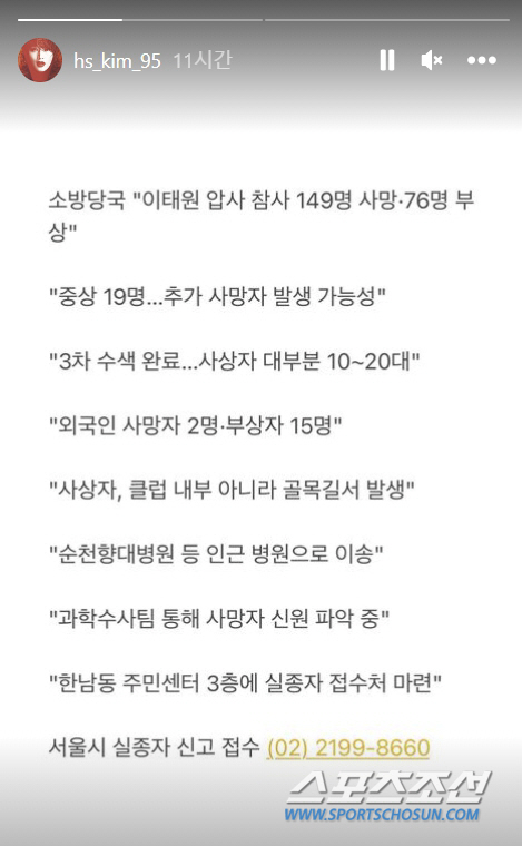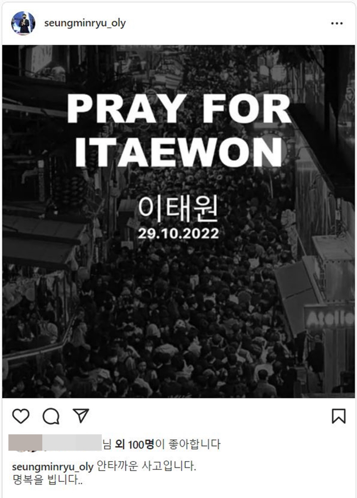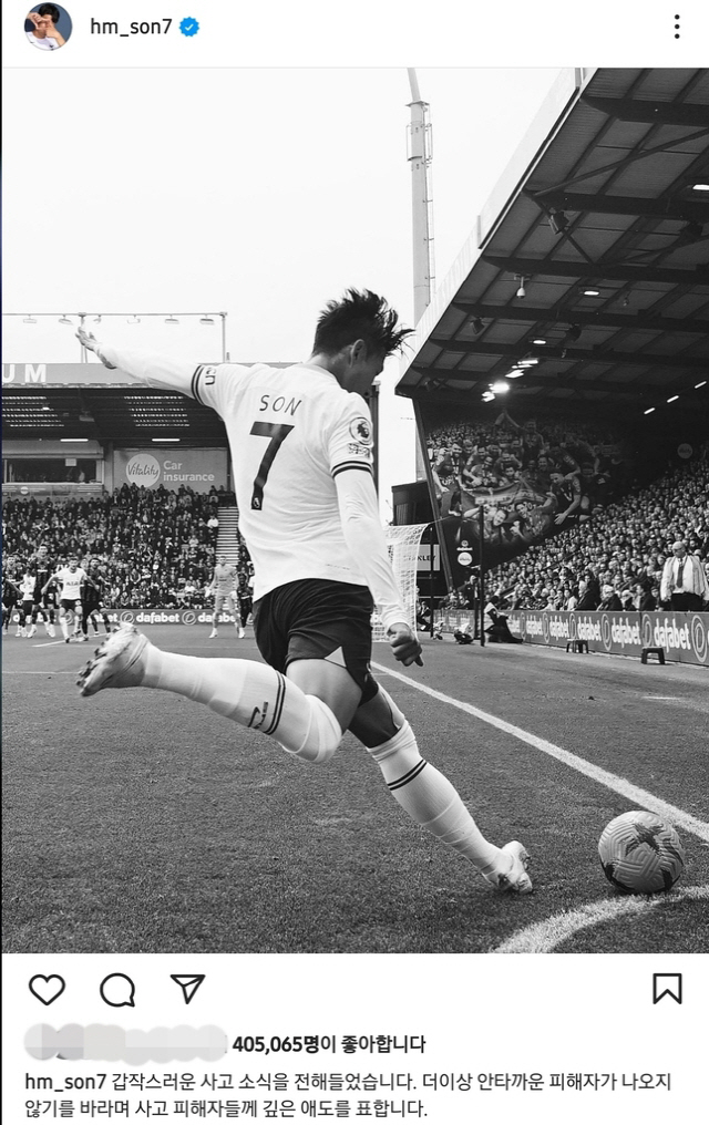 토트넘 손흥민은 30일 자신의 SNS를 통해 "갑작스러운 사고 소식을 전해들었습니다. 더이상 안타까운 피해자가 나오지 않기를 바라며 사고 피해자들께 깊은 애도를 표합니다"라는 글을 남겼다. 영어로 "내 마음이 고국인 한국에 있는 사람들과 함께 있다. 뉴스를 읽게 돼 마음이 아프다. 내가 여러분을 생각하며 여기서 모든 힘을 보내고 있다는 점을 알아줬으면 한다"고 덧붙였다.