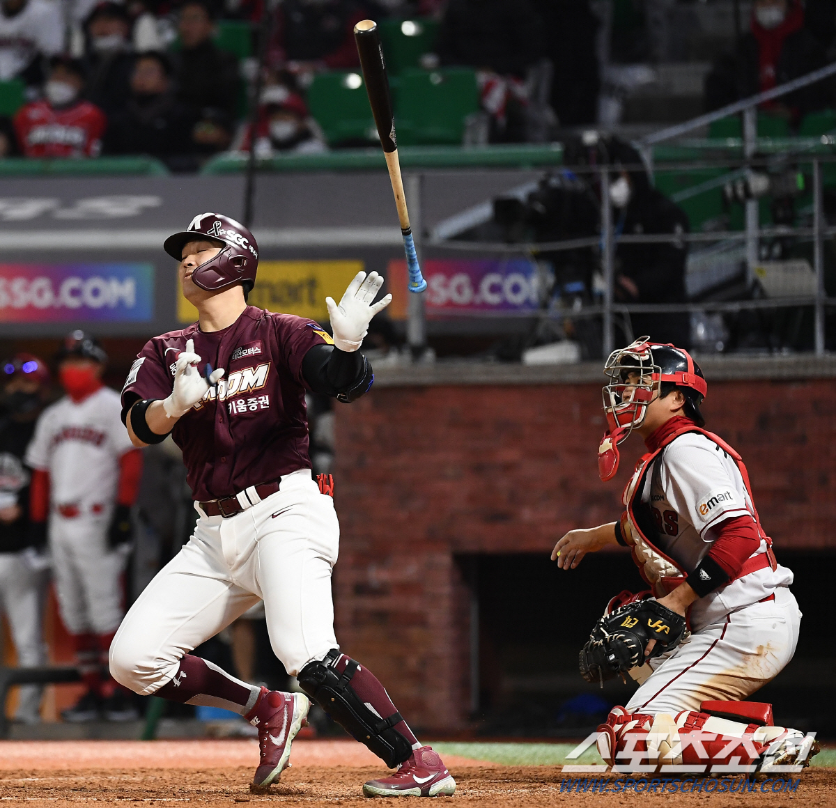 SSG 벤치의 선택도 김재웅의 4구째 141㎞ 패스트볼을 힘껏 들어올렸다. 랜더스필드를 가득 메운 홈팬들의 함성과 함께 높게 비행한 타구의 종착점은 왼쪽 담장 넘어 붉은 물결 속이었다. 6-6 다시 승부를 원점으로 만드는 동점 솔로포. 불혹의 대타가 쏘아올린 역대 포스트시즌 최고령 홈런이었다.