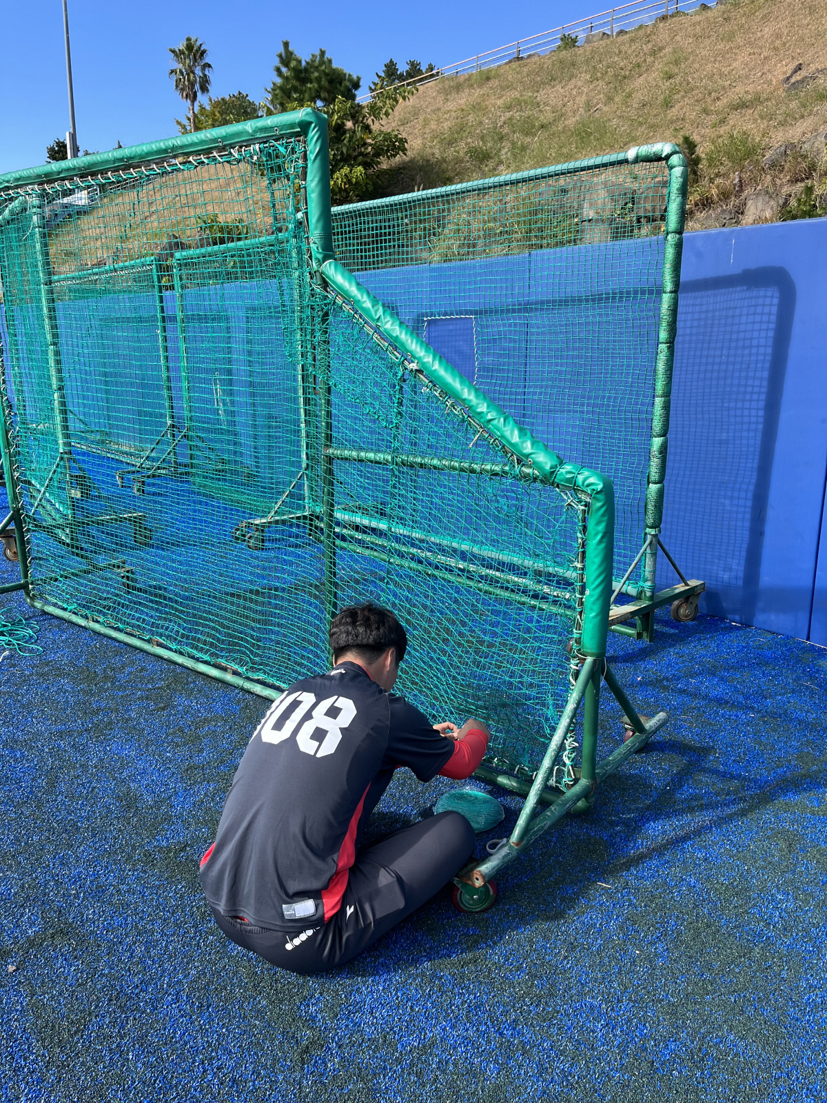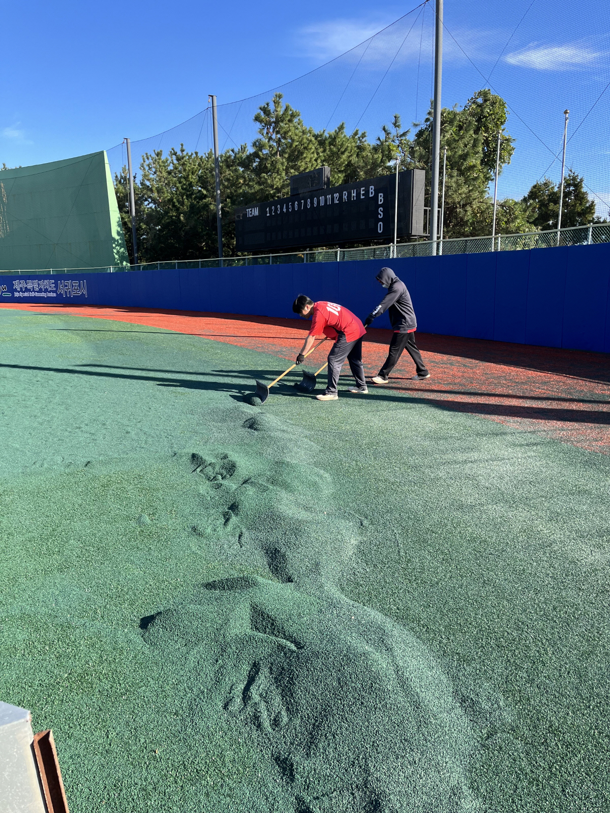 운영1팀 김하원 프로와 보조선수 신용진 목고협 윤용준, 그라운드 관리 업체의 소은택 과장이 지난달 말 선발대로 현지에 도착했을 때, 구장 상태는 정상적인 훈련 진행이 어려운 수준이었다. 사회인팀 사용과 도민체전 여파로 곳곳에 제대로 정비가 이뤄지지 않은 상태였다. 이에 선발대는 메인구장과 보조구장 마운드 흙을 모두 갈아 엎고 새로 다지기 위해 곡괭이를 들어야 했다. 인조잔디 구장인 강창학 구장의 충진재를 채워 놓았고, 그라운드 곳곳에 깔린 자갈도 손으로 일일이 골라내야 했다. 이밖에 메인구장, 보조구장 그물망 등 훈련 시설 보수, 훈련용 매트 제작 등 5일 동안 쉴틈 없이 정비에 매달렸다. 1일 마무리캠프 첫날 일정을 시작한 KIA 김종국 감독은 "사실 프로팀들이 자주 찾는 곳이 아니어서 그라운드 상태에 대해 걱정이 컸는데, 직접 와서 확인해 보니 해외 캠프 여건 못지 않다"고 흡족함을 숨기지 않았다.
