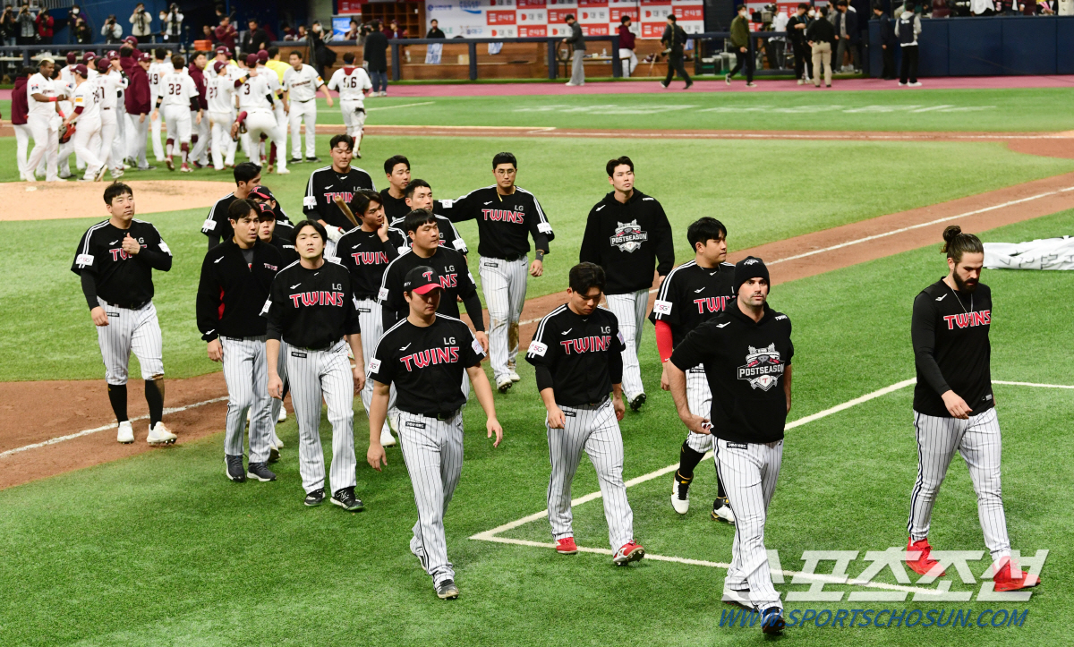 2022 KBO 플레이오프 4차전 LG트윈스와 키움히어로즈의 경기가 28일 고척스카이돔에서 열렸다. LG 선수들이 키움에 1대4 패배를 확정지은후 팬들에게 답례하고 있다. 고척=최문영 기자 deer@sportschosun.com/2022.10.28/