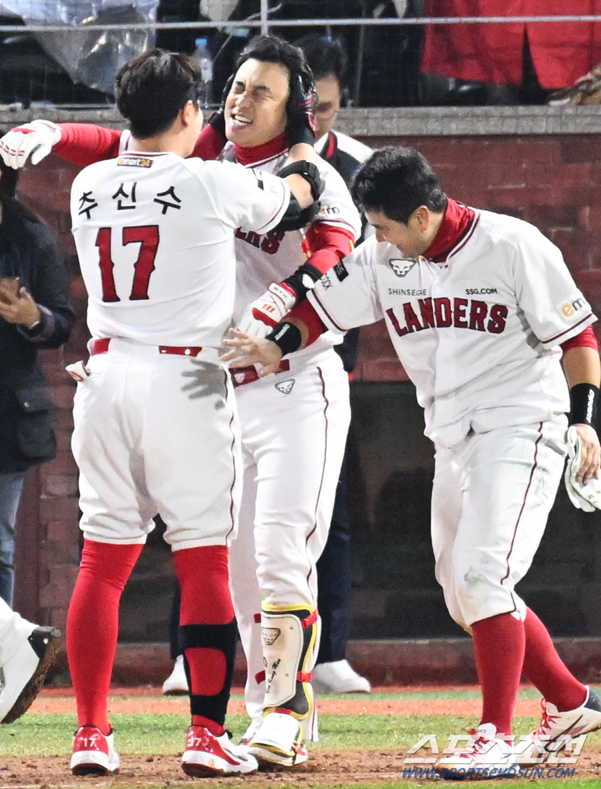 한국시리즈 5차전 키움과 SSG의 경기가 7일 인천 SSG랜더스필드에서 열렸다. 9회말 SSG 김강민이 키움 최원태를 상대로 역전 3점홈런을 날렸다. 김강민과 함께 기뻐하는 추신수. 인천=송정헌 기자songs@sportschosun.com/2022.11.07/