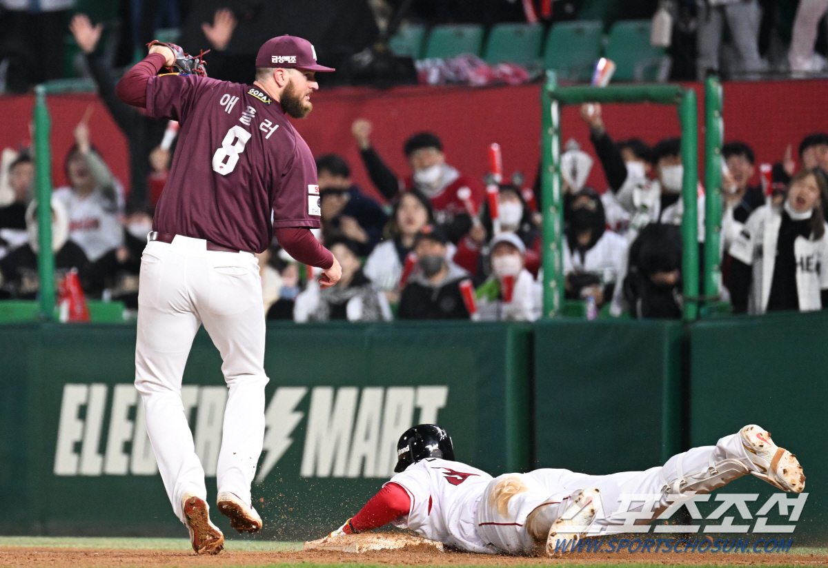 8일 인천 SSG랜더스필드에서 한국시리즈 6차전 SSG와 키움의 경기가 열렸다. 3회말 2사 2, 3루에서 한유섬의 내야땅볼 타구를 키움 전병우 1루수가 송구 실책을 했다. 1루에서 볼을 잡을 수 없었던 애플러. 인천=송정헌 기자songs@sportschosun.com