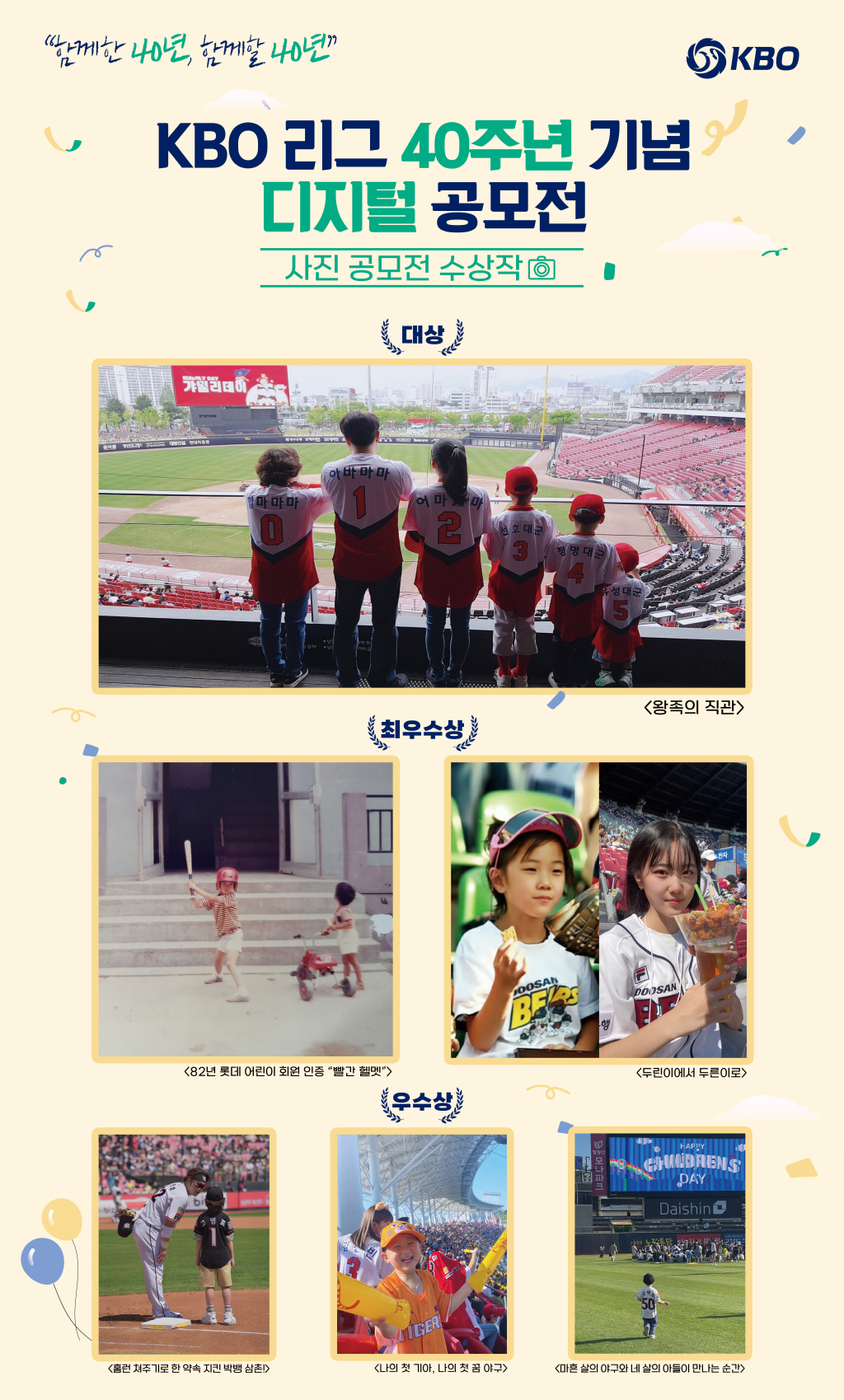 [스포츠조선 이종서 기자] KBO가 팬들과 함께해온 리그 40주년을 기념하고 추억하기 위해 개최한 'KBO 리그 40주년 기념 디지털 공모전'의 수상작을 발표했다.