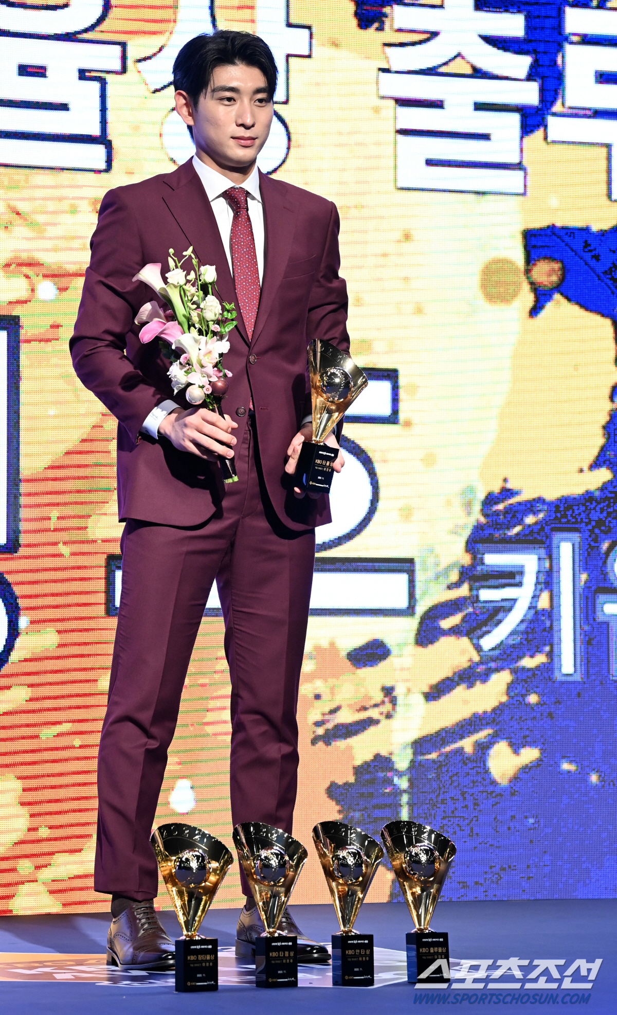 이정후의 개인타이틀 수상 차례가 왔다. 타격 5개 부문 최상단에 이름을 올린 이정후에게 눈부신 황금색의 트로피 5개가 수여될 예정이었다.