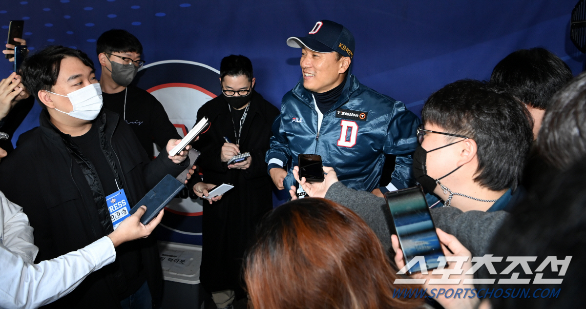 두산 베어스와 '최강야구' 최강 몬스터즈의 경기가 20일 잠실야구장에서 열린다. 경기 전 두산 이승엽 감독이 인터뷰를 하고 있다. 잠실=허상욱 기자wook@sportschosun.com/2022.11.20/