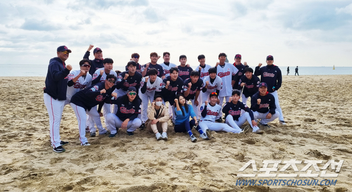 [부산=스포츠조선 김영록 기자]해운대 백사장에 한무리의 부산 사나이들이 나타났다. 가슴팍에 호쾌하게 씌어진 '자이언츠(GIANTS)'가 눈에 띈다.