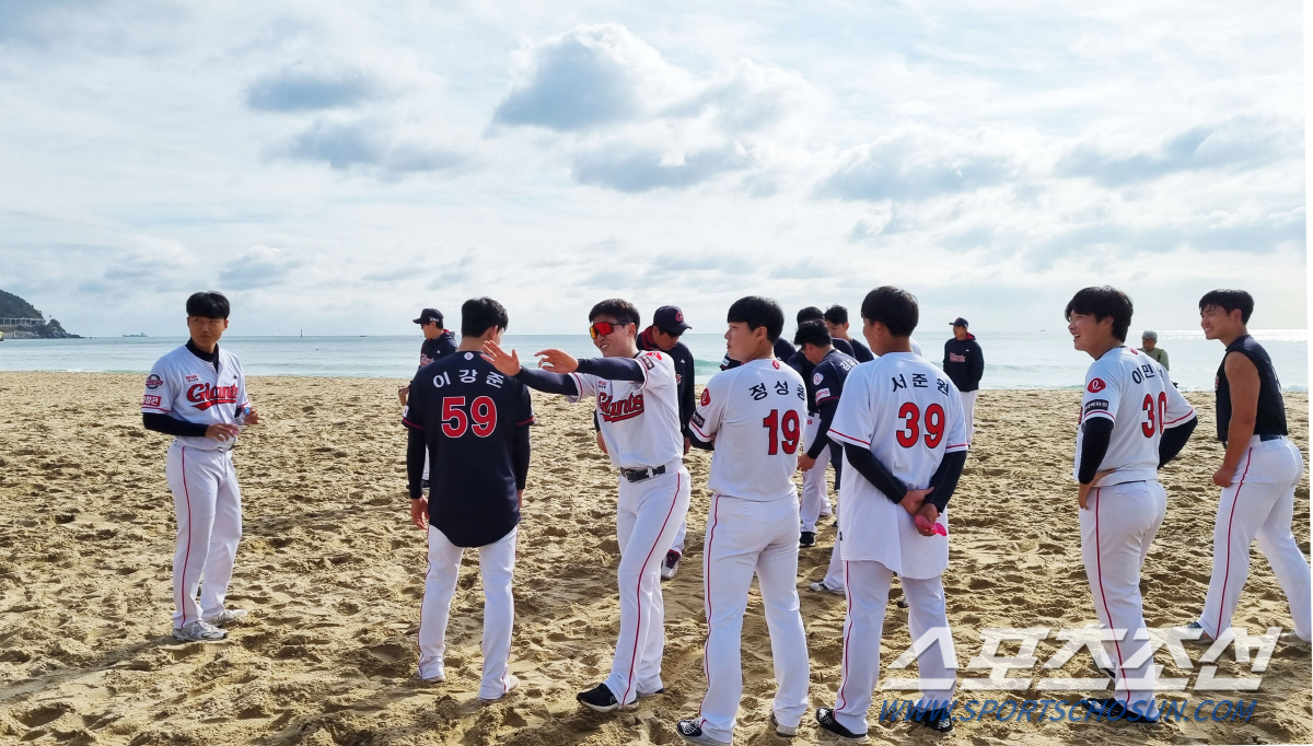 배영수 코치가 준비한 야심찬 이벤트다. 그는 "모래사장에서 뛰어다니는 게 쉽지 않다. 단순한 기분 전환이 아니라 그 자체로 하체 강화훈련"이라고 강조했다.