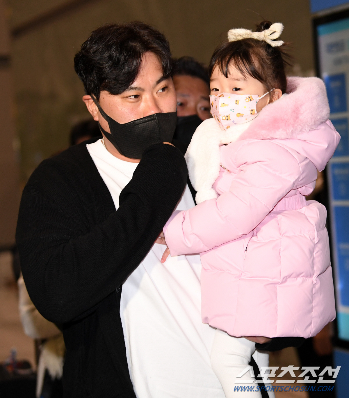 딸의 손을 잡고 걷던 류현진은 체크인존으로 들어가기 위해 딸을 껴안은 채로 이동해 남다른 사랑을 과시했다.