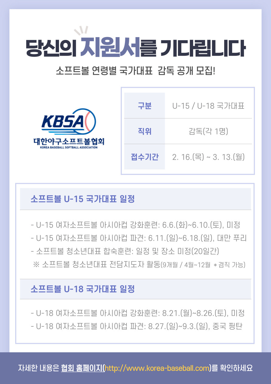 [스포츠조선 정현석 기자]대한야구소프트볼협회가 2023년 연령별 여자 소프트볼 아시아컵에 파견할 지도자를 다음달 13일까지 공개 모집한다.