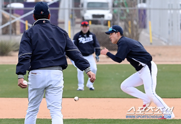 2루에서도 똑같은 방식으로 훈련이 진행됐다. 안방 마님 양의지가 홈까지 달릴 수 있다는 손짓을 했지만, 김 코치가 굴린 공은 검은색 공. 안방마님은 무리하면 안 된다.