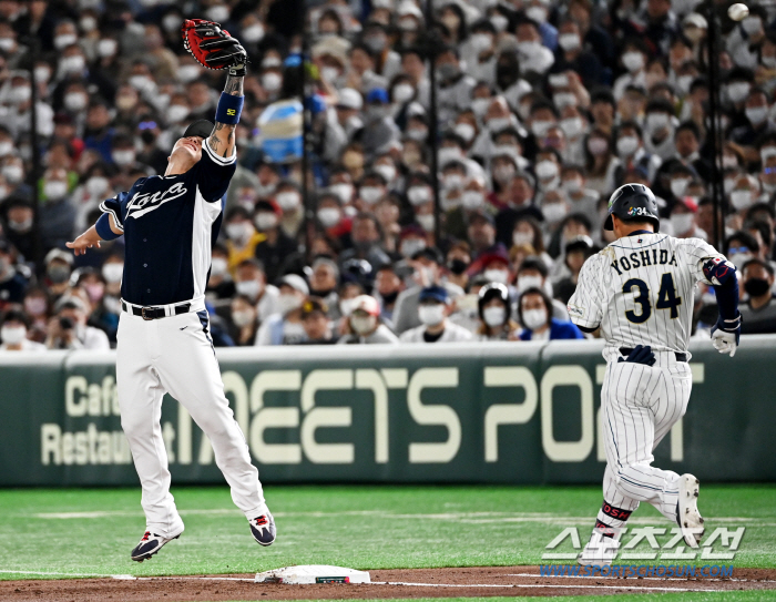 0-0이던 2회 1사 후 요시다 마사타카의 어려운 땅볼을 잡은 뒤 악송구를 범해 2루까지 내보냈다. 선취점을 내줄 뻔 했던 아찔한 장면이었다. 견제구 포구를 정확히 못해 공을 흘리는 모습도 두차례나 포착됐다.