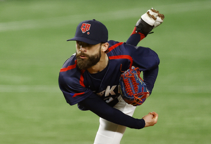 체코의 온드레이 사토리아가 11일 일본과의 경기서 선발등판해 공을 뿌리고 있다. 로이터 연합뉴스