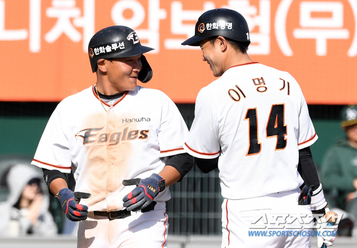 [대전=스포츠조선 박재만 기자] "코치님 저 생각보다 빠른 발이에요" 수훈 선수 인터뷰를 마친 김태연이 정민태 전 코치를 향해 입담을 뽐냈다.
