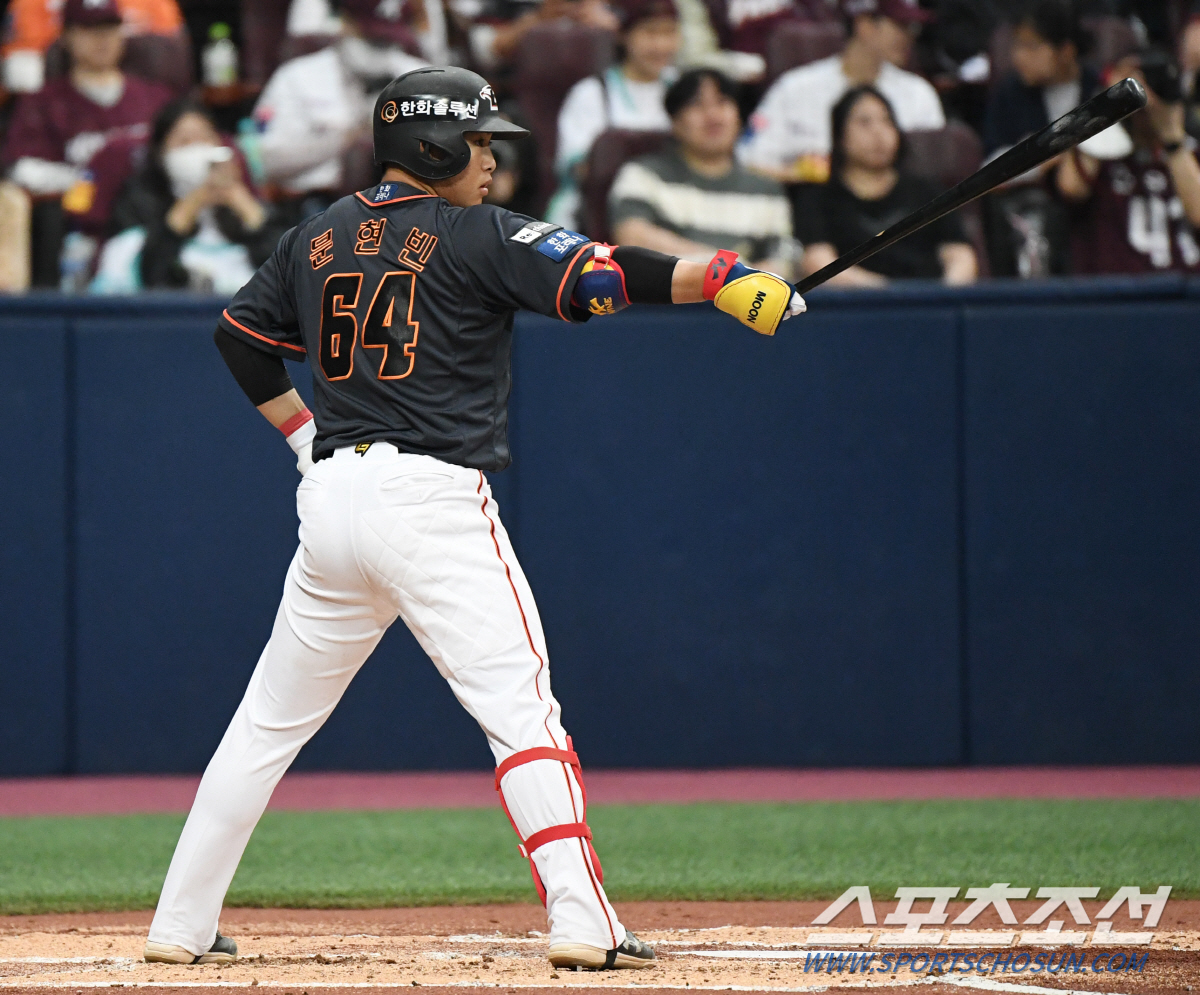 문현빈은 7회, 안우진에 이어 등판한 김태훈을 맞아 좌익수쪽 3루타를 때렸다. KBO리그 첫 안타가 큰지막한 장타다. 8회 삼진으로 아웃돼 4타수 1안타로 프로 첫 경기를 마쳤다. 2일 경기 땐 벤치를 지켰다.