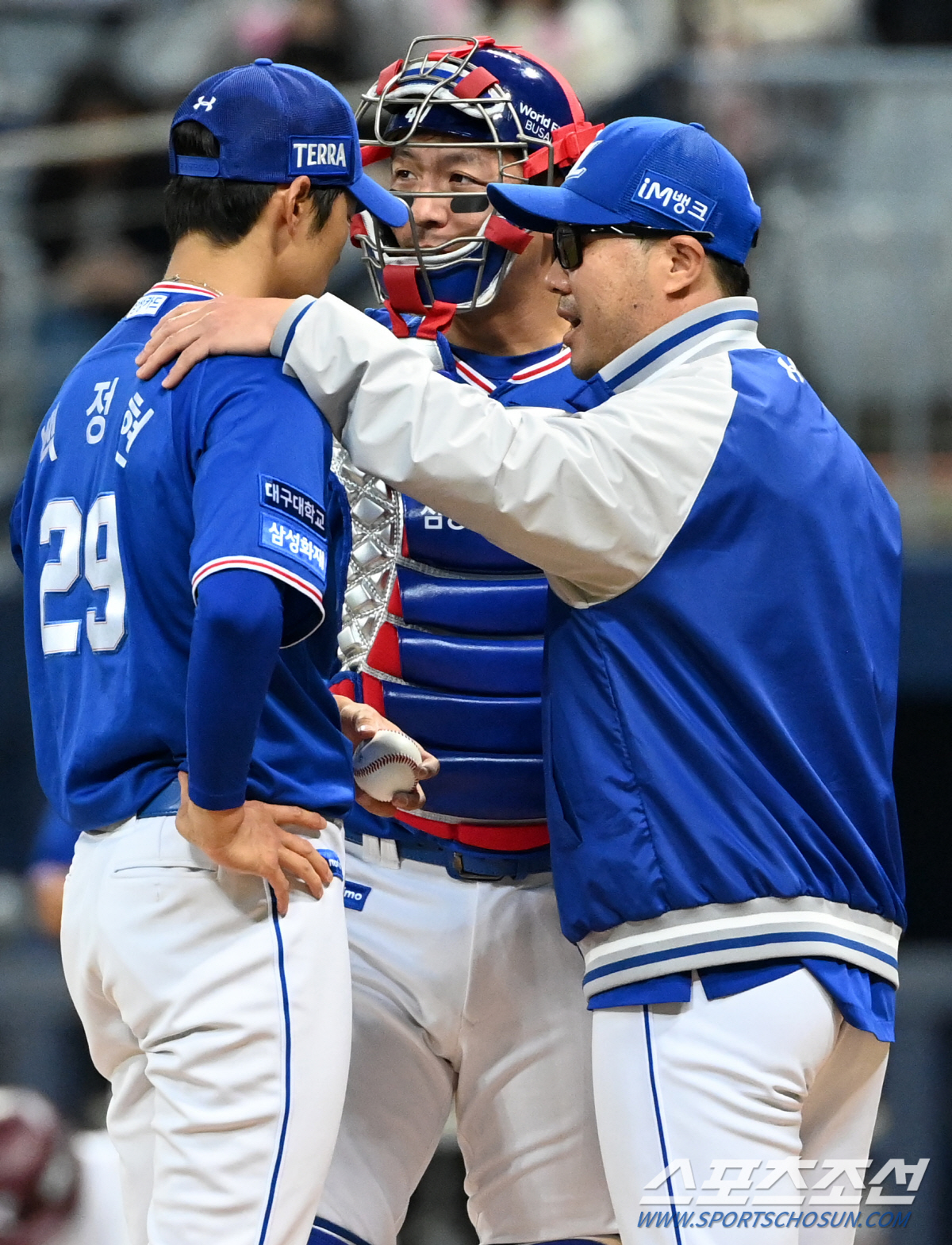 2023 KBO리그 삼성 라이온즈와 키움 히어로즈의 경기가 18일 고척스카이돔에서 열렸다. 삼성 백정현이 8회말 1사 키움 러셀에 내야안타를 내주며 퍼펙트 행진이 끝나자 박진만 감독이 마운드에 올라 이야기를 하고 있다. 고척=허상욱 기자wook@sportschosun.com/2023.04.18/