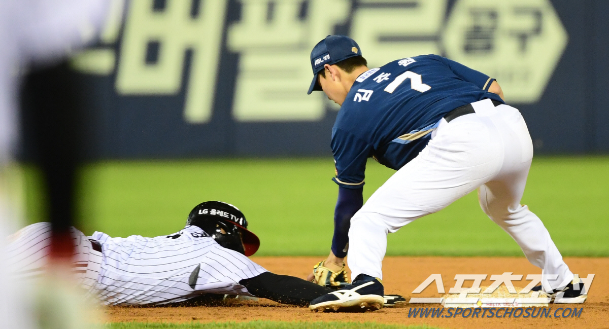 2023 KBO리그 LG트윈스와 NC다이노스의 경기가 18일 잠실야구장에서 열렸다. NC 박건우가 5회초 2사 1,3루에서 손아섭 타석때 2루 도루중 아웃되고 있다. 그사이 3루주자 도태훈이 득점에 성공했다. 잠실=최문영 기자 deer@sportschosun.com /2023.04.18/
