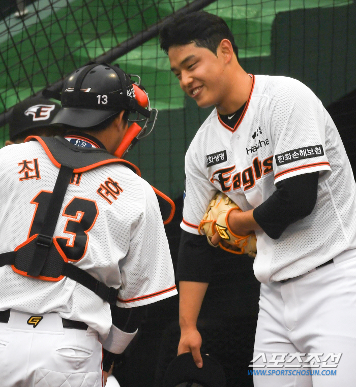 포수 뒤에서 지켜본 문동주의 볼은 가볍게 던지는 것처럼 보였지만 미트에 꽂히는 순간 엄청난 포구음을 냈다. 최종 리허설을 마친 문동주는 불펜을 나서기 직전 포수 최재훈과 대화를 나누며 해맑게 웃었다.