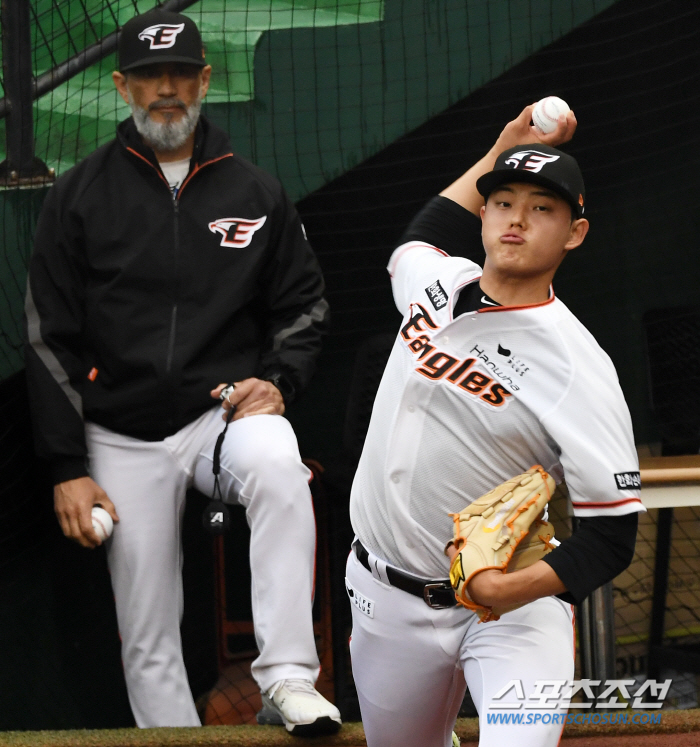 예열을 마친 문동주는 불펜으로 발걸음을 옮겼다. 포수 최재훈과 사인을 맞춘 뒤 불펜 피칭을 시작한 문동주. 등판 직전 밸런스를 잡아가며 가볍게 툭 던진 공은 순식간에 포수 미트에 꽂혔다.