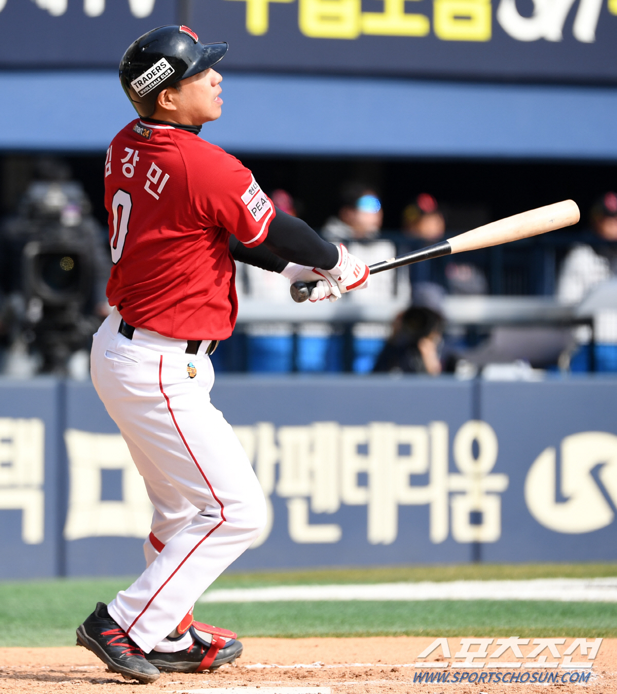 SSG가 1-2로 뒤진 4회초. 2아웃 주자 없는 상황에서 KT 선발 투수 벤자민을 상대한 김강민이 먼저 홈런을 날렸다. 김강민은 초구 볼 이후 2구째를 받아쳐 좌월 솔로 홈런으로 연결시켰다. 자신의 시즌 첫 홈런이다.
