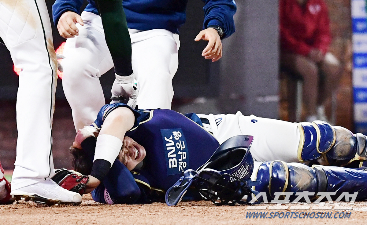 14일 인천 SSG랜더스필드에서 KBO리그 SSG와 NC의 경기가 열렸다. 6회 2사 2루에서 SSG 에레디아의 헛스윙 방망이가 NC 박세혁 포수의 머리를 가격했다. 고통을 호소하고 있는 박세혁. 인천=송정헌 기자songs@sportschosun.com/2023.04.14/