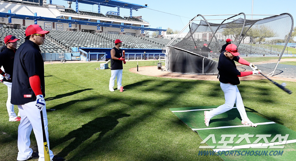 KIA 타이거즈가 2일 미국 애리조나주 투손에 위치한 키노 스포츠 콤플렉스에서 훈련했다. 나성범이 김도영의 타격 훈련을 지켜보고 있다. 애리조나 투손(미국)=정재근 기자 cjg@sportschosun.com/2023.2.2/