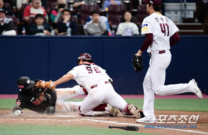 안우진으로서는 가장 마주치기 싫은 타자를 실점 위기에서 만나게 됐다. 안우진은 초구로 157㎞ 직구를 던졌고, 문상철의 배트는 헛돌았다. 2구 째. 그러나 문상철이 기습적으로 번트를 댔고, 타구는 투수 정면으로 향했다. 3루에 있던 알포드의 스피드 역시 빠르지 않았다. 알포드가 홈으로 들어오려고 했지만, 결국 아웃. 1사 1.3루가 2사 1,2루로 바뀌게 됐다.