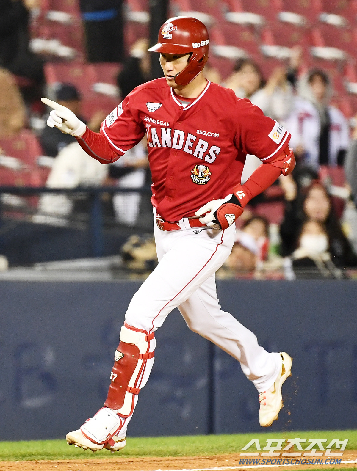 2023 KBO리그 LG 트윈스와 SSG 랜더스의 경기가 26일 잠실구장에서 열렸다. 4회초 선두타자 SSG 오태곤이 솔로포를 날린 뒤 환호하고 있다. 잠실=박재만 기자pjm@sportschosun.com/2023.04.26/