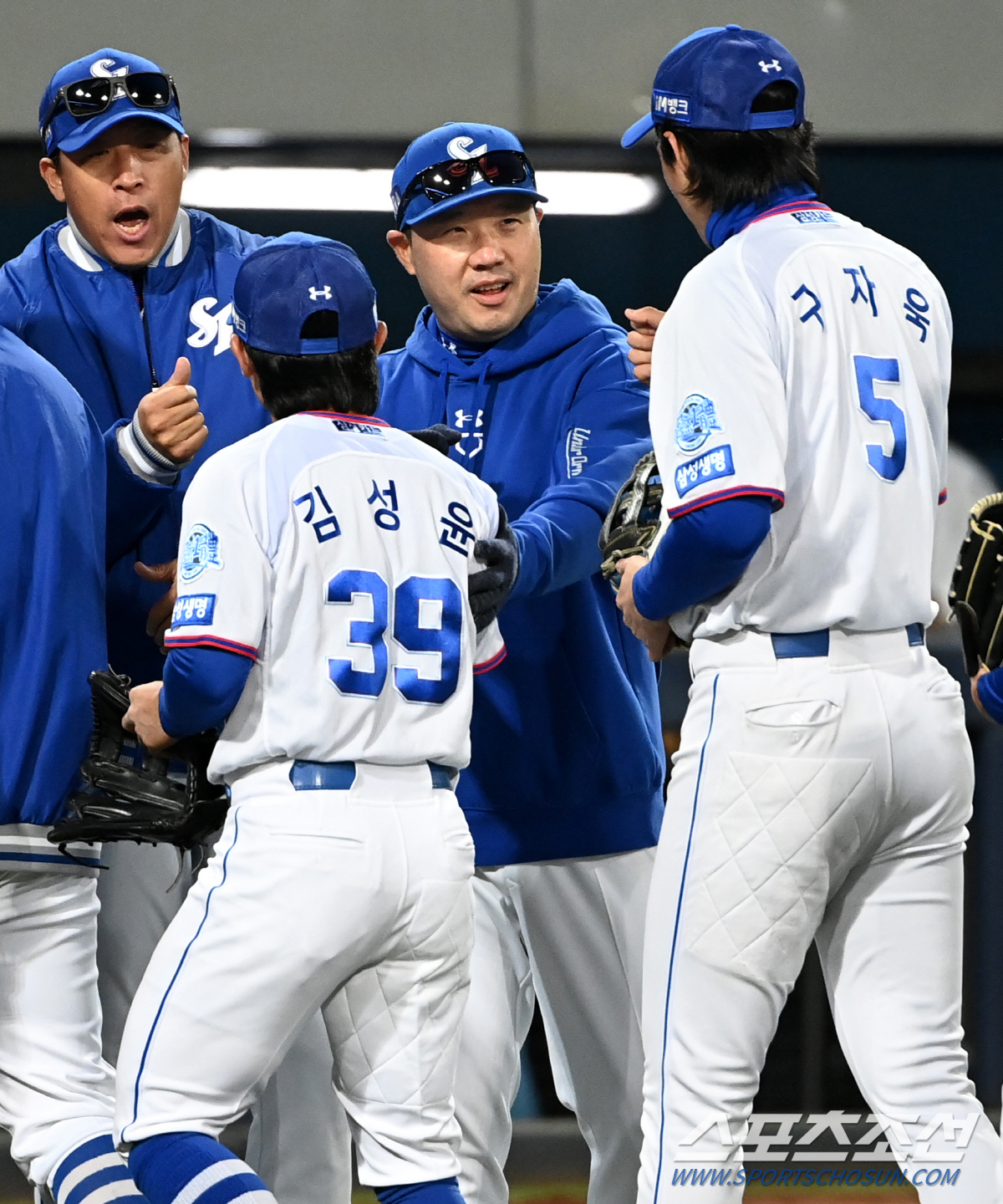 2023 KBO리그 두산 베어스와 삼성 라이온즈의 경기가 26일 대구 삼성라이온즈파크에서 열렸다. 삼성이 1대0으로 승리했다. 경기 종료 후 기쁨을 나누는 박진만 감독과 김성윤, 구자욱의 모습. 대구=허상욱 기자wook@sportschosun.com/2023.04.26/