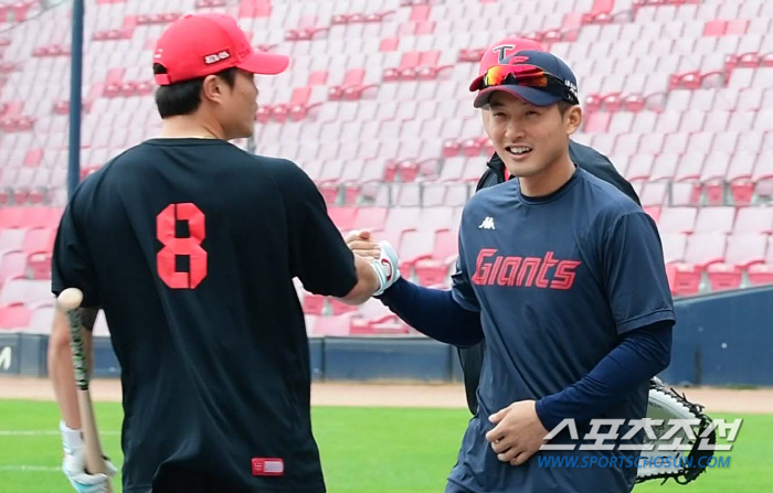 한 살 형인 김대유는 유강남을 꼭 껴안은 뒤 두 손을 꼭 잡았다. 김대유와 유강남의 손을 꼭 잡은 채 외야 훈련장까지 함께 걸었다.
