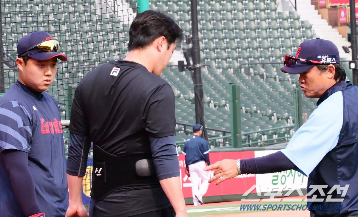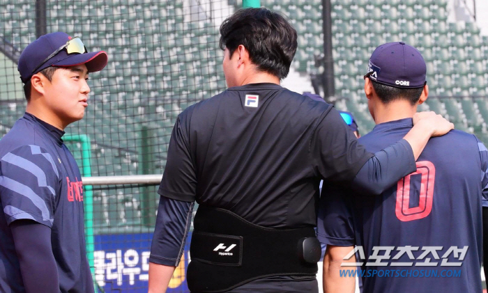 허리 부상은 분명 아니라고 했다. 롯데 선수들은 양석환의 허리 보호대가 신기한 듯 쳐다보며 만져보기도 했다. 양석환은 허리 보호대의 장점을 동료들에게 친절하게 설명했다.