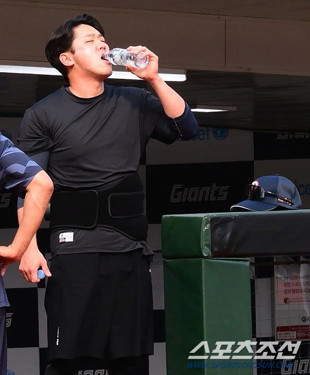 롯데와 경기를 앞두고 사직구장에 도착한 양석환은 허리 보호대를 차고 롯데 선수들과 인사를 나눴다.