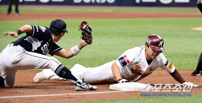 그런데 중계 방송사의 느린 화면으로 봤을 때 3루수 허경민의 글러브가 김휘집의 유니폼에 제대로 태그가 되지 않는 장면이 잡혔다. 손을 뻗어 베이스를 터치하는 김휘집의 손도 약간 더 빠른 것으로 보였다.