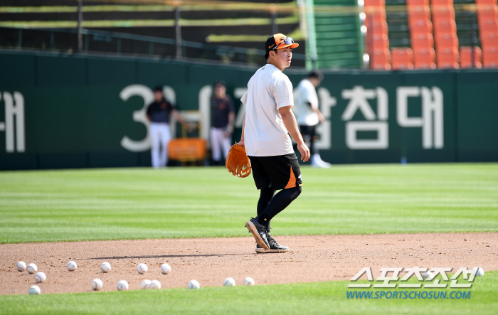 최윤석 수비 코치와 함께 그라운드에 나온 문현빈은 내야 땅볼 타구에 맞춰 스텝을 밟은 뒤 글러브 포구면에 정확히 공을 담아내는 훈련에 집중했다. 야구를 볼 때 야수들의 병살 플레이가 쉬워 보이지만 셀 수도 없는 연습량과 반복을 통해 만든 동작이다. 기본기가 탄탄한 문현빈도 최윤석 수비 코치 주문대로 타구를 잡아 2루를 향해 토스하는 동작을 반복했다.