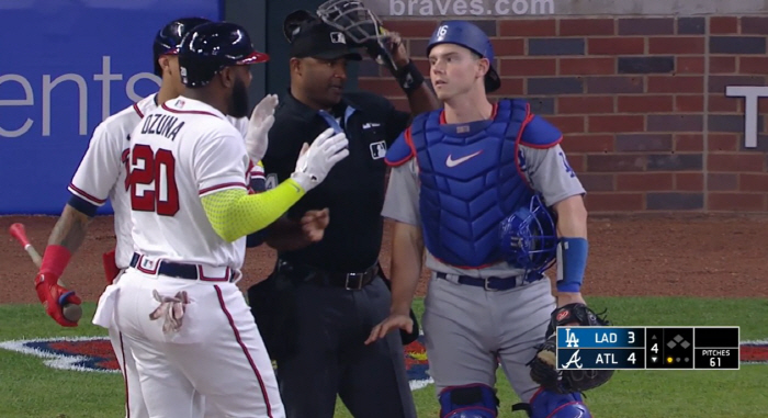 4-3으로 앞선 애틀랜타의 4회말 공격, 지명타자 마르셀 오수나가 선두타자로 들어섰다. 그는 좌익수 뜬공으로 물러났다. 한데 타격을 한 뒤 오수나의 팔로스루한 배트가 포수 스미스의 헬멧을 강타했다. 충격을 받았는지 스미스는 배트에 맞고는 금세 일어나 더그아웃으로 발길을 옮기던 오수나를 불러세우더니 뭔가를 외치기 시작했다.