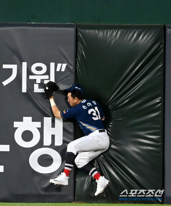 | 2023 KBO리그 NC 다이노스와 롯데 자이언츠의 경기가 23일 부산 사직구장에서 열렸다. 4회말 1사 2,3루 NC 좌익수 손아섭이 롯데 한동희의 타구를 잡아내며 펜스와 충돌하고 있다. 부산=허상욱 기자wook@sportschosun.com/2023.05.23/ |