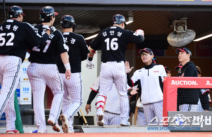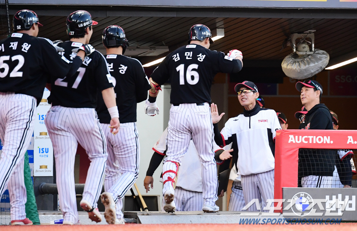 23일 인천 SSG랜더스필드에서 KBO리그 SSG와 LG의 경기가 열렸다. 4회 2사 만루에서 LG 김민성이 만루홈런을 날렸다. 염경엽 감독과 하이파이브를 나누고 있는 김민성. 인천=송정헌 기자songs@sportschosun.com/2023.05.23/